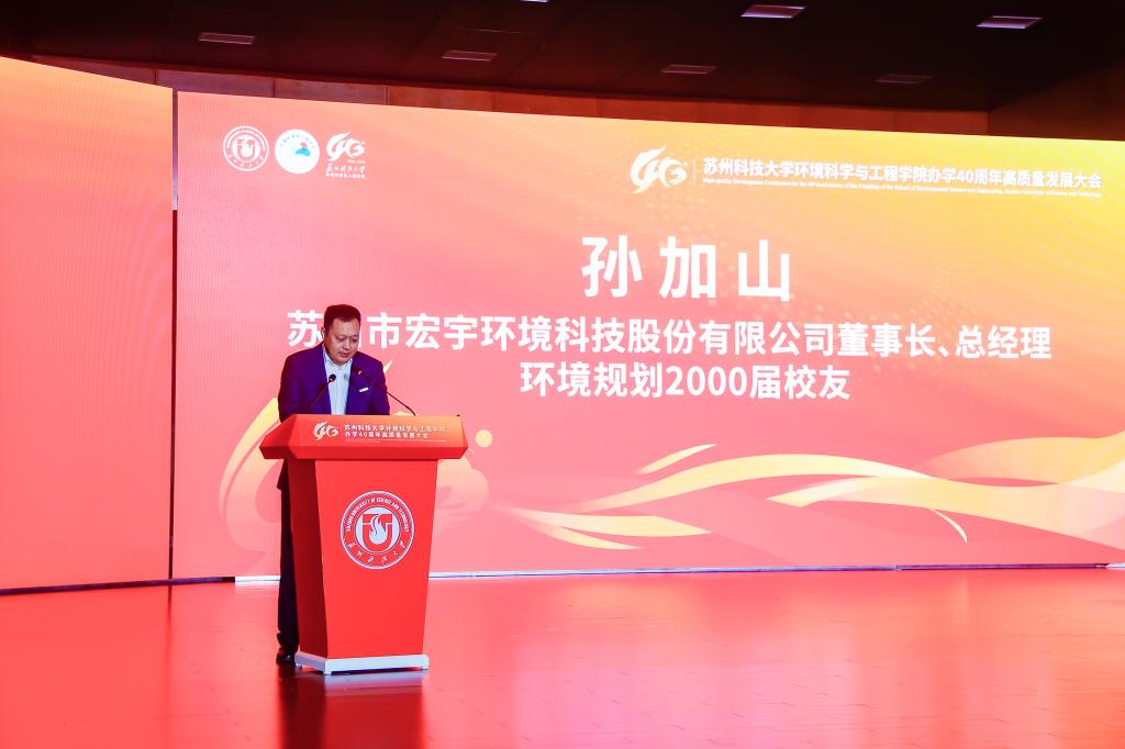 在校友代表发言环节,2000届校友、苏州市宏宇环境科技股份有限公司董事长孙加山,2001届校友、云南师范大学能源与环境科学成人影院